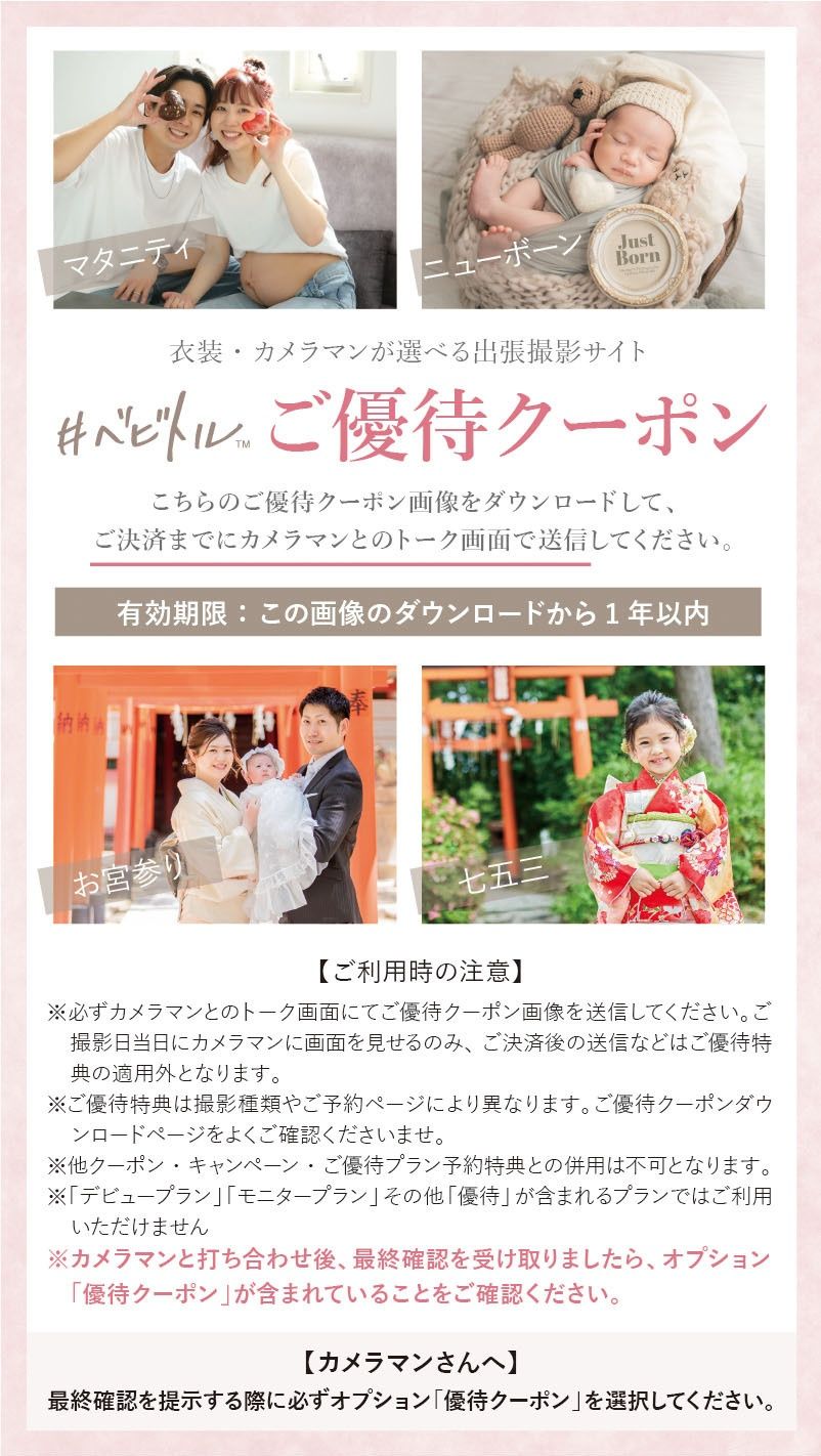 ※こちらのクーポンは、ニューボーン撮影のみにご利用いただけます(スタンダードプラン・等身大アルバムプラン・等身大&ギフトプラン・ボリュームプラン)