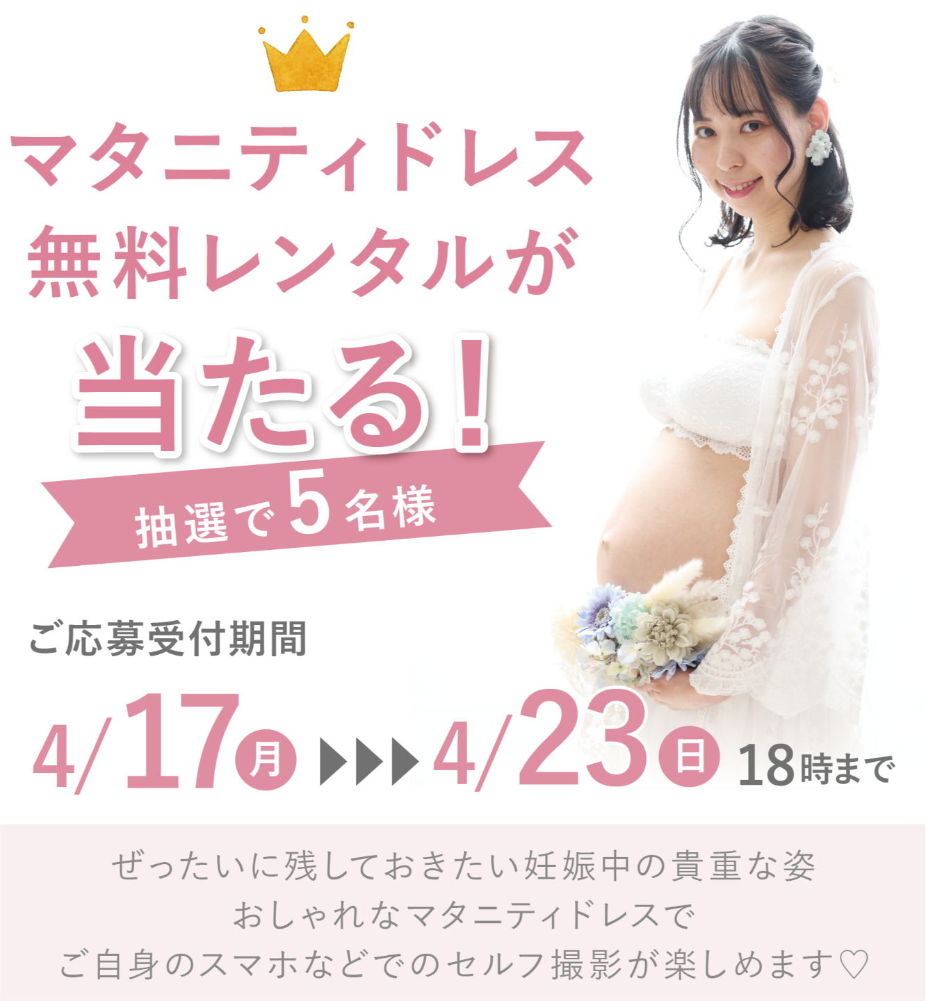 憧れのマタニティフォト。「撮ってみたいけど、スタジオ撮影は恥ずかしい…」「費用を抑えておしゃれに撮りたい♡」 そんなママのお声にお応えして抽選で5名様にドレスを無料でレンタル致します!